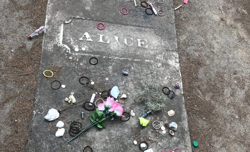 Alice Flagg was born into an upper class family in the early nineteenth century. Unfortunately, she fell in love with a man who was not “suitable” for her to marry. Her family was not pleased with his social standing. Alice’s brother was a prominent doctor and extremely outspoken about his disapproval. Like most sisters, Alice completely ignored her big bro and eventually became “betrothed” to her secret love. Since we live in the 21st Century, let’s use the word engaged. She hid the engagement by wearing her ring on a necklace around her neck. Once her family found out about the relationship, she was sent to a boarding school. Alice eventually contracted malaria and was brought home so her family could care for her. When the brother found the ring around her neck, he took it and threw it away. Sadly, Alice grew delirious with sickness (probably compounded by her broken heart) and spent her final days begging for the ring back. Alice is buried in the Flagg family plot at All Saints Cemetery in Pawleys Island.